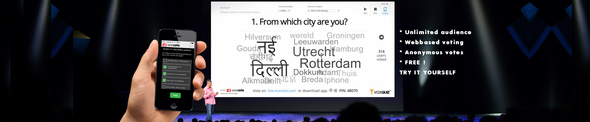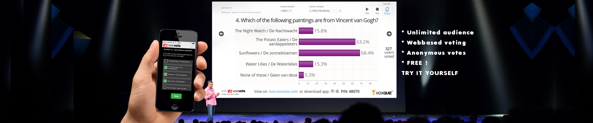 - Create/prepare your questions in advance. With VoxVote you can preview your questions, vote yourself and see how the graphs will look on the big screen.