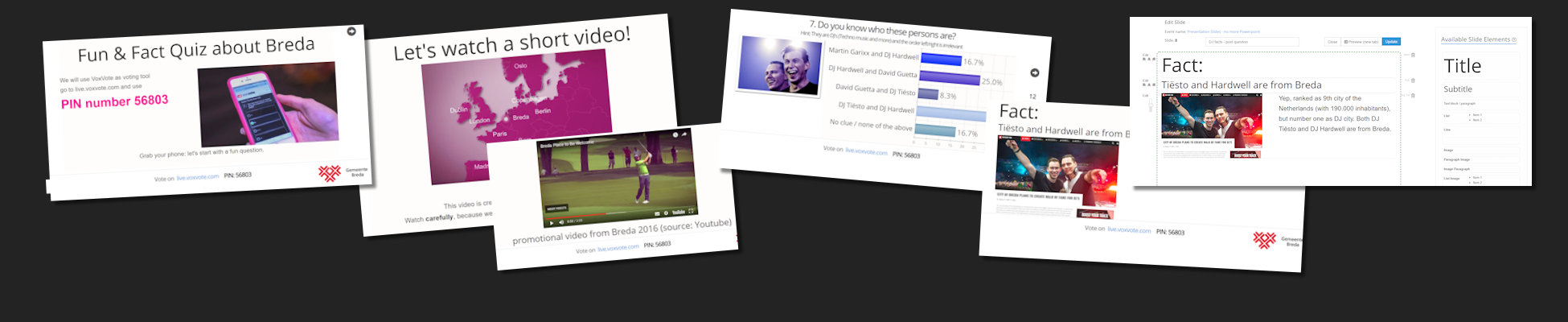 Go live within 2 minutes. We've already created the first question for you. You receive 5 events for free (worth 150 euro) and allow UNLIMITED audience voting.